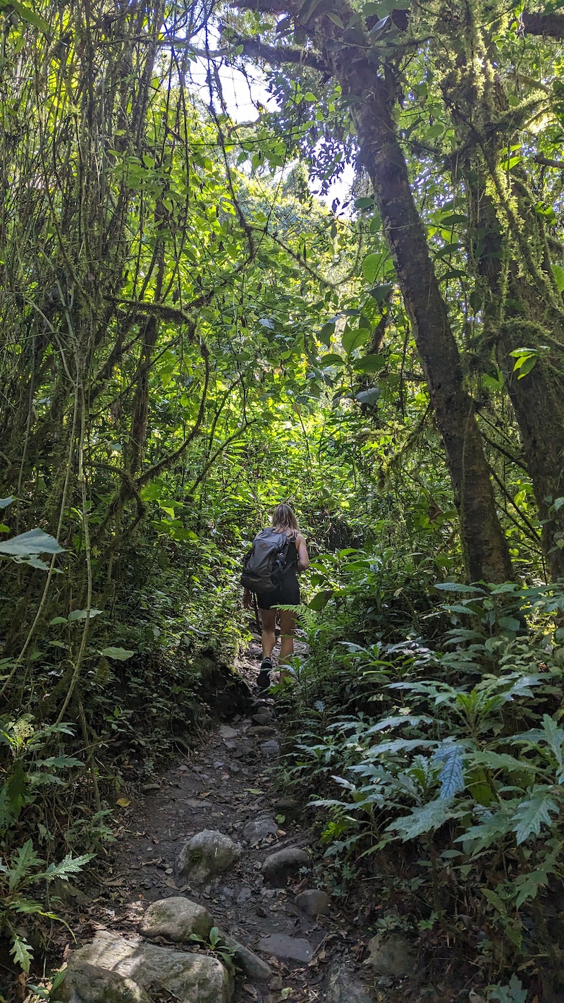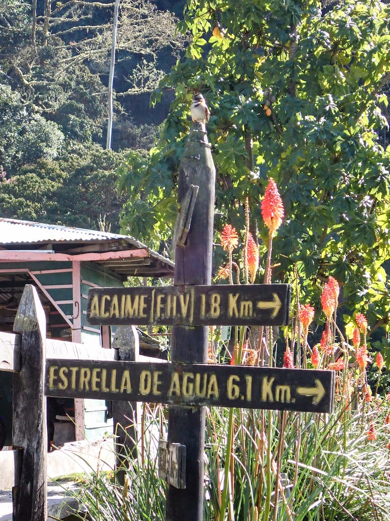 Daarna loop je alsmaar rechtdoor tot je bij Finca la Montana bent. Hier aangekomen vind je een hek dat op slot zit, maar aan de zijkant is een opening waar je doorheen kunt komen. Op de prachtige bloemen die je hier vindt, zitten vaak kolibries, dus let goed op of je ze ziet. Je hebt hier een cafeetje waar je wat kunt eten en drinken of even naar de wc kunt gaan. Vervolgens neem je de weg hier naar beneden, richting Acaime.